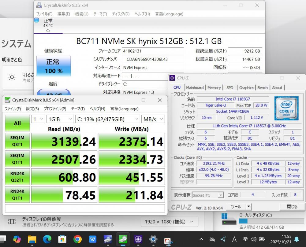 | CPU: 超高速 Intel 卓越性能 第11世代Core i7-1185G7 3.0Ghz、 4コア8スレッド (ターボ・ブースト利用時の最大周波数 4.8GHz) |