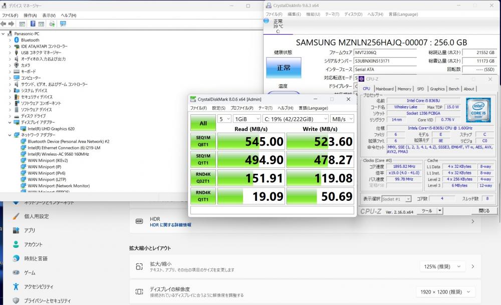 | CPU: 超高速 Intel 高性能 第8世代Core i5-8365U 1.6Ghz、 4コア8スレッド (ターボ・ブースト利用時の最大周波数 4.1GHz) |