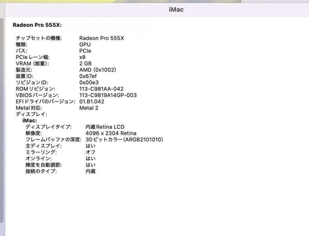 ディスプレイ: 4K対応 21.5インチ光沢液晶 高輝度 広視野角 LEDバックライト 4096 x 2304解像度 グラフィックス Radeon Pro 555X 搭載、大容量 2048M専用ビデオメモリーvRAM 快適使用体験! 専門向けのグラフィックスですが、ゲーミング性能にも、NVIDIA GT 1030 < Radeon Pro 555X < NVIDIA GTX 650Ti |