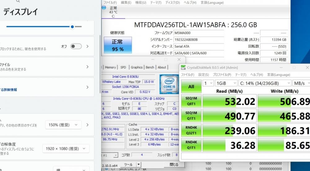 CPU:    超高速 Intel 高性能 第8世代Core i5-8365u 1.6Ghz、 4コア8スレッド (ターボ・ブースト利用時の最大周波数 4.1GHz)