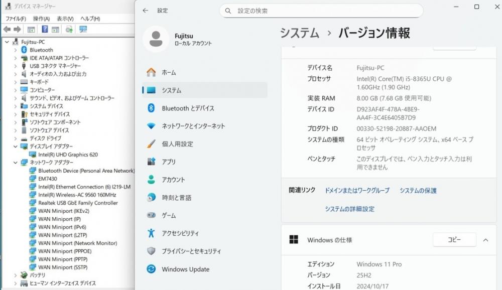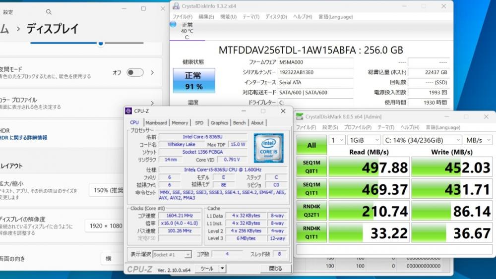 | CPU: 超高速 Intel 高性能 第8世代Core i5-8365u 1.6Ghz、 4コア8スレッド (ターボ・ブースト利用時の最大周波数 4.1GHz) |
