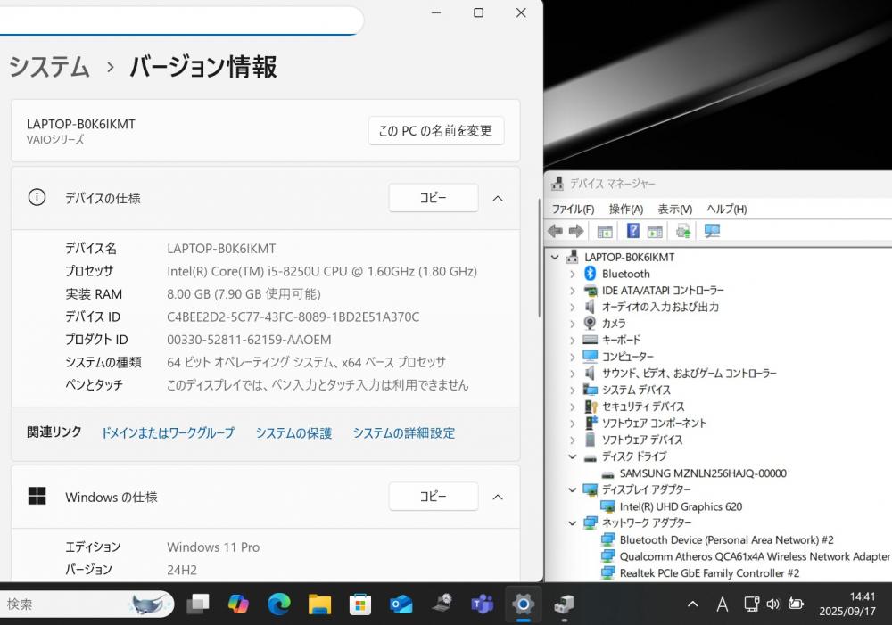 中古 フルHD 13.3型 SONY VAIO VJPG11C11N Windows11 第8世代 i5-8250U 8GB 256GB-SSD カメラ 無線 Office付き 中古パソコン  管:1614j
