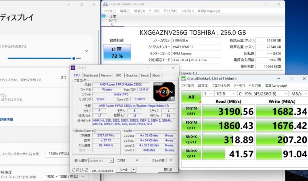 | CPU: 超高速 高性能 AMD Ryzen 5-PRO 3500U 2.1Ghz、 4コア8スレッド (ターボ・ブースト利用時の最大周波数 3.7GHz) |