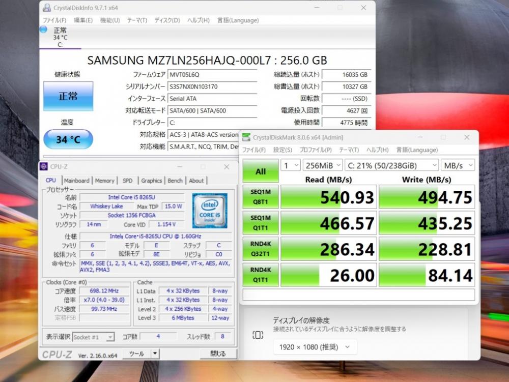 | CPU: 超高速 Intel 高性能 第8世代Core i5-8265U 1.6Ghz、 4コア8スレッド (ターボ・ブースト利用時の最大周波数 3.9GHz) |