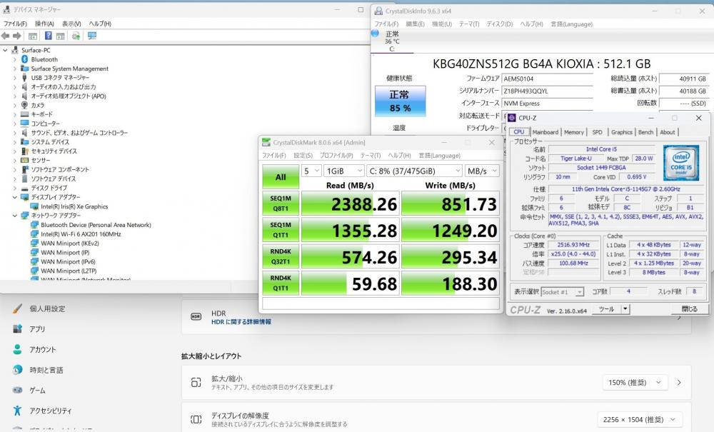 CPU:    超高速 Intel 卓越性能 第11世代Core i5-1145G7 2.6Ghz、 4コア8スレッド (ターボ・ブースト利用時の最大周波数 4.4GHz)