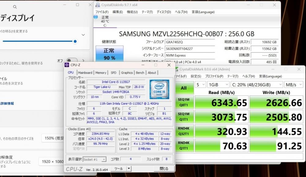 CPU:    超高速 Intel 卓越性能 第11世代Core i5-1135g7 2.4Ghz、 4コア8スレッド (ターボ・ブースト利用時の最大周波数 4.2GHz)
