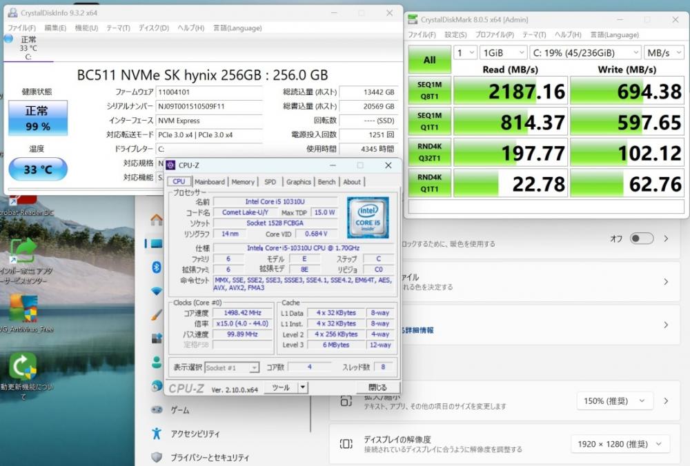 CPU: 超高速 Intel 超高性能 第10世代Core i5-10310u 1.7Ghz、 4コア8スレッド (ターボ・ブースト利用時の最大周波数 4.4GHz) |