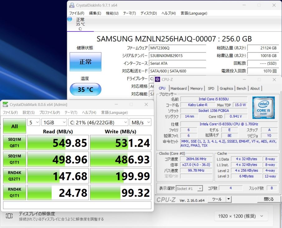 | CPU: 超高速 Intel 高性能 第8世代Core i5-8350U 1.7Ghz、 4コア8スレッド (ターボ・ブースト利用時の最大周波数 3.6GHz) |