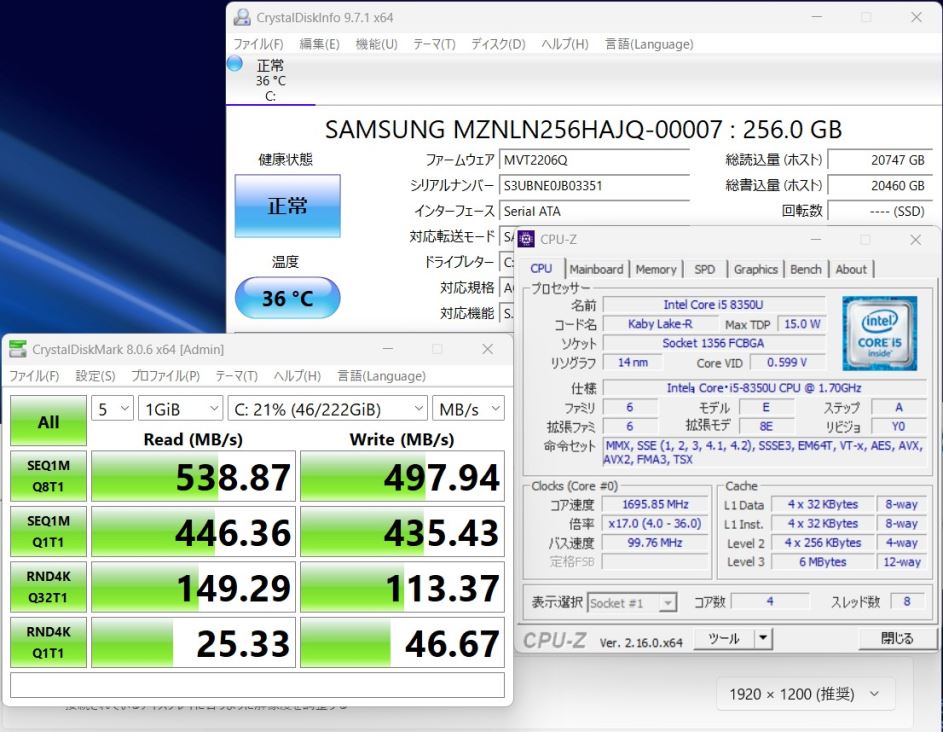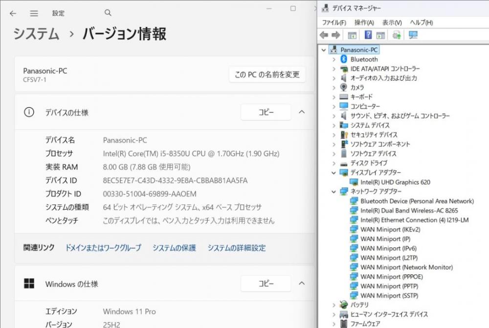 | CPU: 超高速 Intel 高性能 第8世代Core i5-8350U 1.7Ghz、 4コア8スレッド (ターボ・ブースト利用時の最大周波数 3.6GHz) |