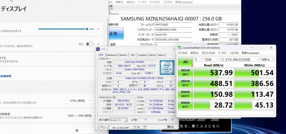 | CPU: 超高速 Intel 高性能 第8世代Core i5-8350U 1.7Ghz、 4コア8スレッド (ターボ・ブースト利用時の最大周波数 3.6GHz) |