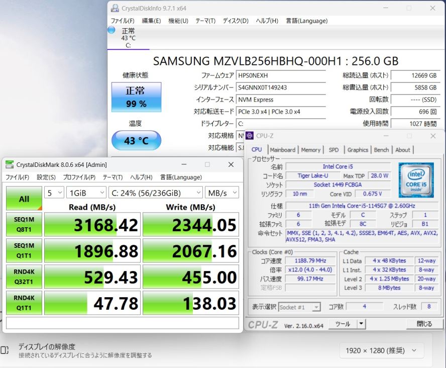 | CPU: 超高速 Intel 卓越性能 第11世代Core i5-1145G7 2.6Ghz、 4コア8スレッド (ターボ・ブースト利用時の最大周波数 4.4GHz) |