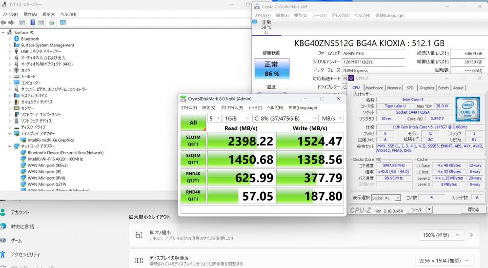 | CPU: 超高速 Intel 卓越性能 第11世代Core i5-1145G7 2.6Ghz、 4コア8スレッド (ターボ・ブースト利用時の最大周波数 4.4GHz) |