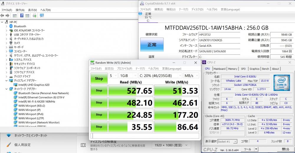 | CPU: 超高速 Intel 高性能 第8世代Core i5-8265U 1.6Ghz、 4コア8スレッド (ターボ・ブースト利用時の最大周波数 3.9GHz) |