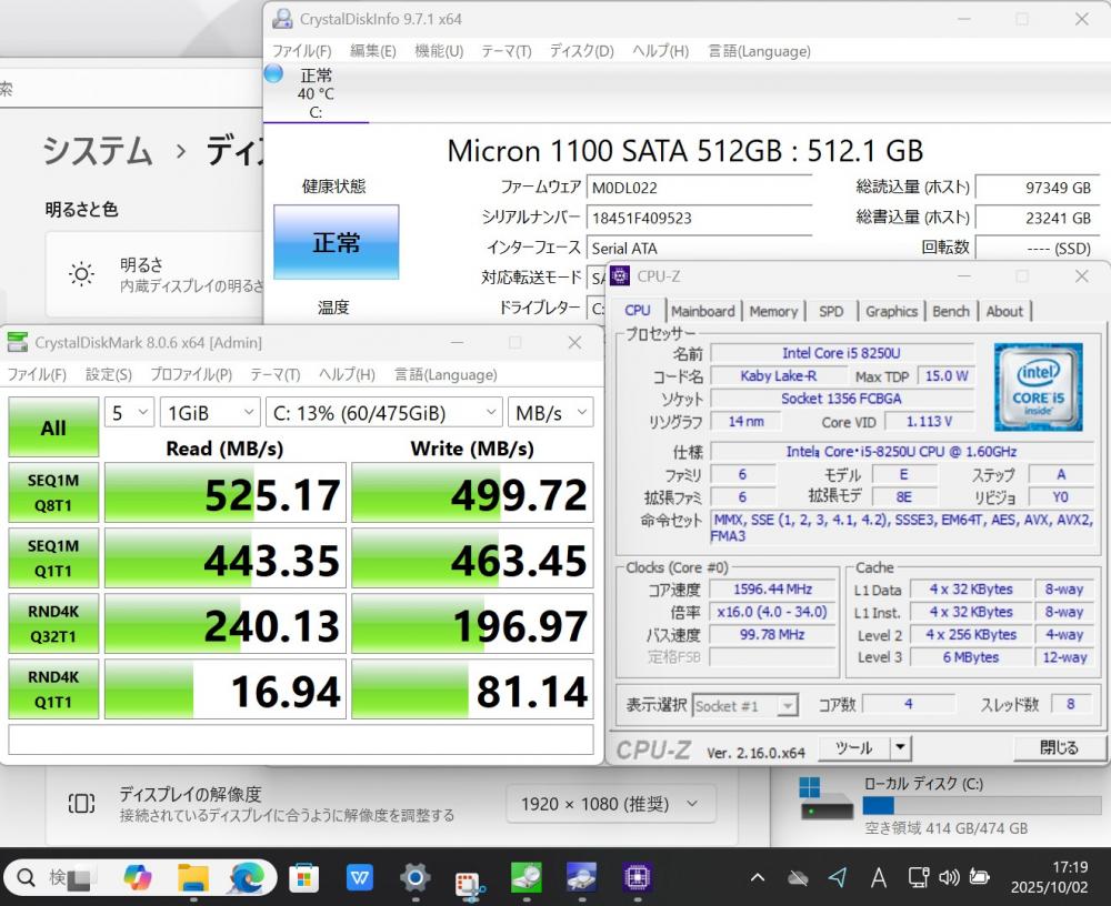 | CPU: 超高速 Intel 高性能 第8世代Core i5-8250U 1.6Ghz、 4コア8スレッド (ターボ・ブースト利用時の最大周波数 3.4GHz) |
