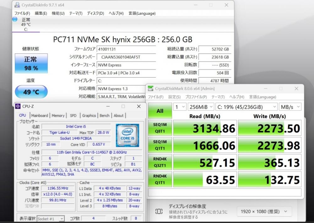 | CPU: 超高速 Intel 卓越性能 第11世代Core i5-1145G7 2.6Ghz、 4コア8スレッド (ターボ・ブースト利用時の最大周波数 4.4GHz) |