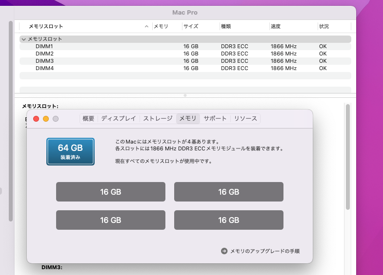 メモリ:  快適超大容量 64GB メモリースロット合計:4 (空き0)