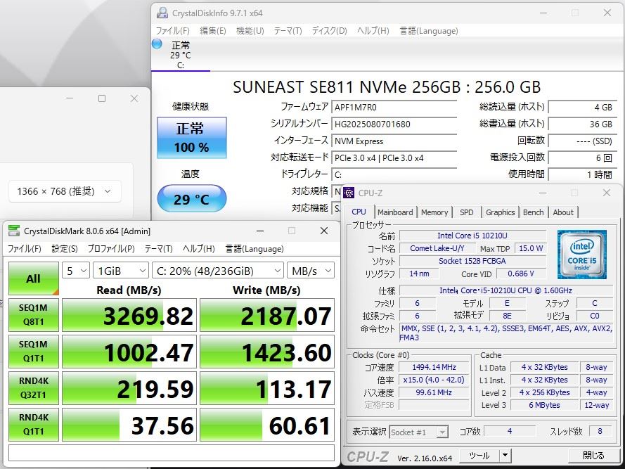 | CPU: 超高速 Intel 超高性能 第10世代Core i5-10210U 1.6Ghz、 4コア8スレッド (ターボ・ブースト利用時の最大周波数 4.2GHz) |