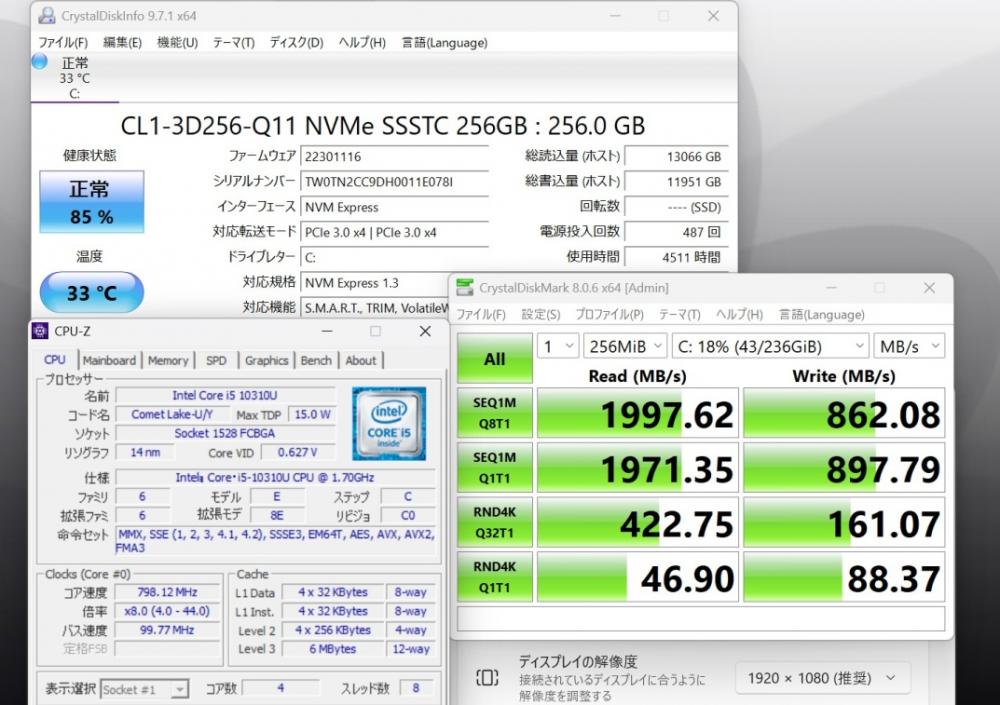 | CPU: 超高速 Intel 超高性能 第10世代Core i5-10310u 1.7Ghz、 4コア8スレッド (ターボ・ブースト利用時の最大周波数 4.4GHz) |