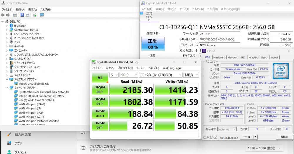 | CPU: 超高速 Intel 高性能 第8世代Core i5-8265U 1.6Ghz、 4コア8スレッド (ターボ・ブースト利用時の最大周波数 3.9GHz) |