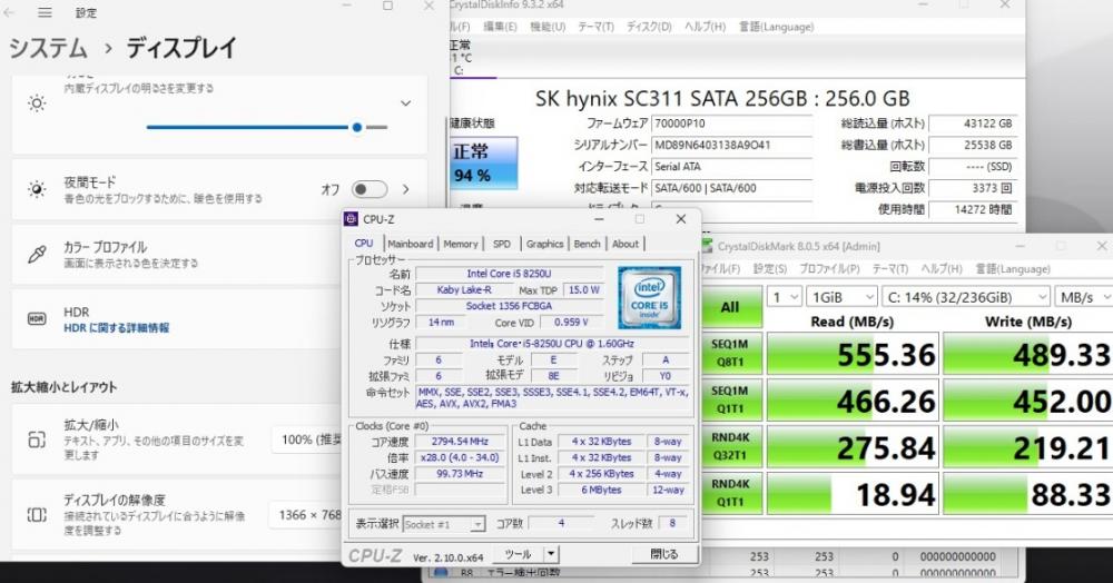 CPU:    超高速 Intel 高性能 第8世代Core i5-8250u 1.6Ghz、 4コア8スレッド (ターボ・ブースト利用時の最大周波数 3.4GHz)