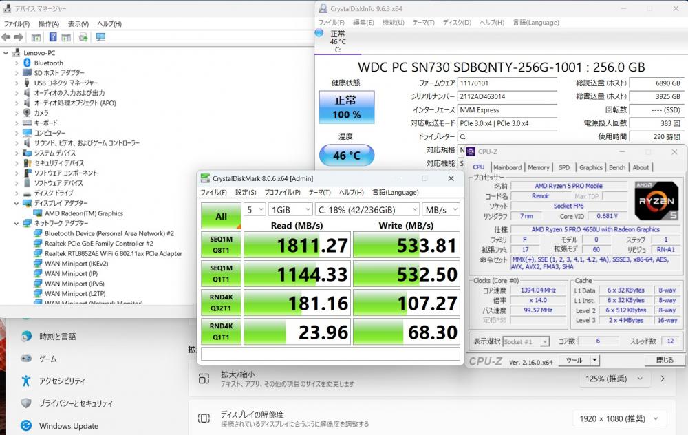 | CPU: 超高速 高性能 AMD Ryzen 5-PRO 4650U 2.1Ghz、 6コア12スレッド (ターボ・ブースト利用時の最大周波数 4.0GHz) |