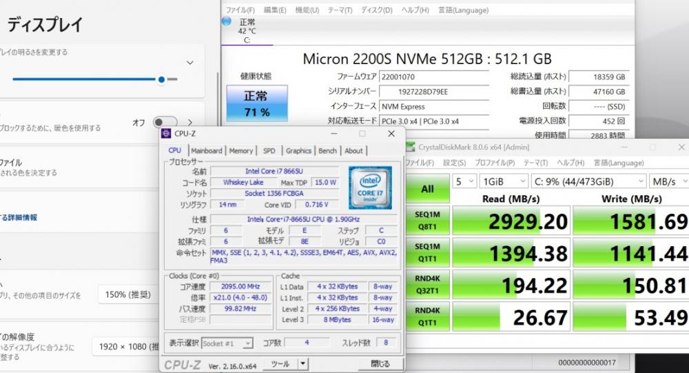 CPU: 超高速 Intel 高性能 第8世代Core i7-8665u 1.9Ghz、 4コア8スレッド (ターボ・ブースト利用時の最大周波数 4.8GHz) |