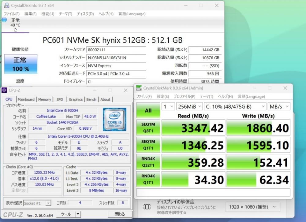 CPU:    超高速 Intel 超高性能 第9世代Core i5-9300H 2.4Ghz、 4コア8スレッド (ターボ・ブースト利用時の最大周波数 4.1GHz)