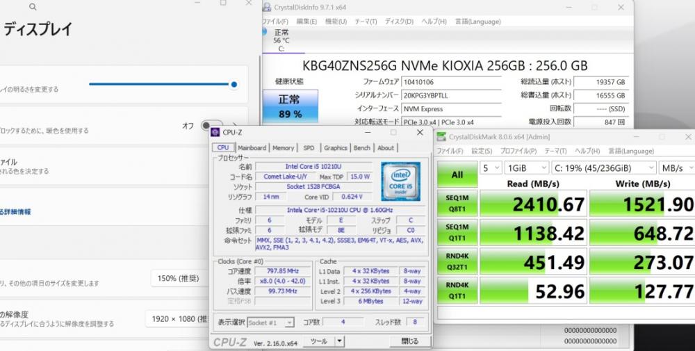 CPU:    超高速 Intel 超高性能 第10世代Core i5-10210u 1.6Ghz、 4コア8スレッド (ターボ・ブースト利用時の最大周波数 4.2GHz)
