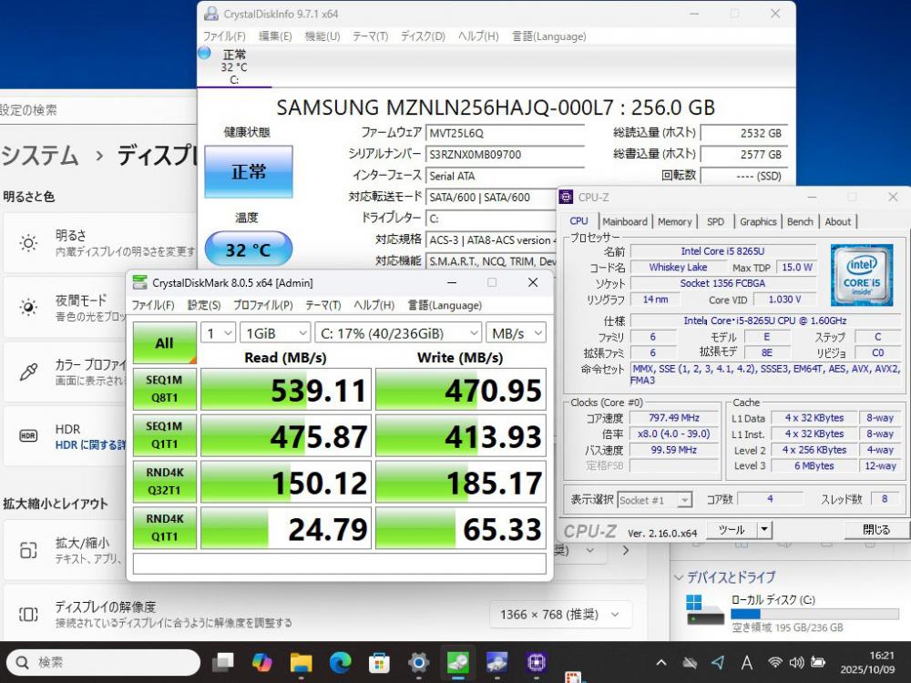 | CPU: 超高速 Intel 高性能 第8世代Core i5-8265u 1.6Ghz、 4コア8スレッド (ターボ・ブースト利用時の最大周波数 3.9GHz) |