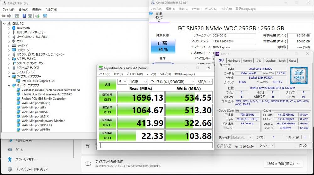 CPU:    超高速 Intel 高性能 第8世代Core i5-8250U 1.6Ghz、 4コア8スレッド (ターボ・ブースト利用時の最大周波数 3.4GHz)