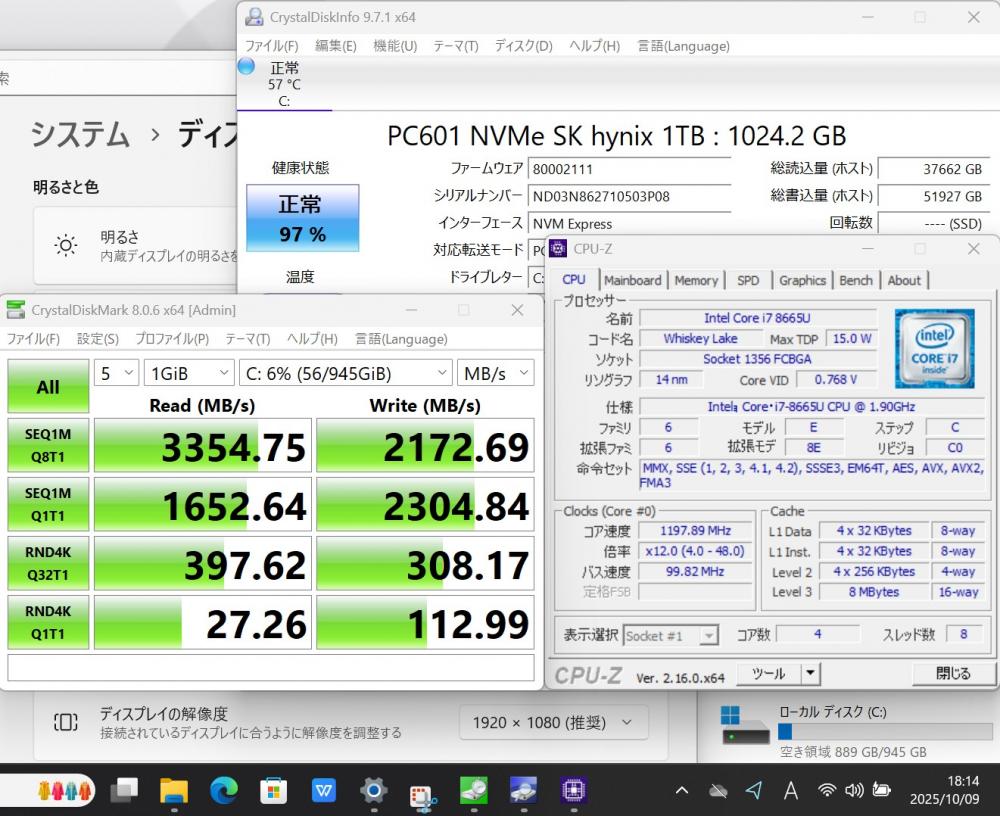ハードディスク: 爆速NVMe式 SSD 1024GB超高速ドライブを搭載 静かで耐衝撃性に優れ、OSやプログラムなどのソフトの起動速度が大幅に高速化します!! |