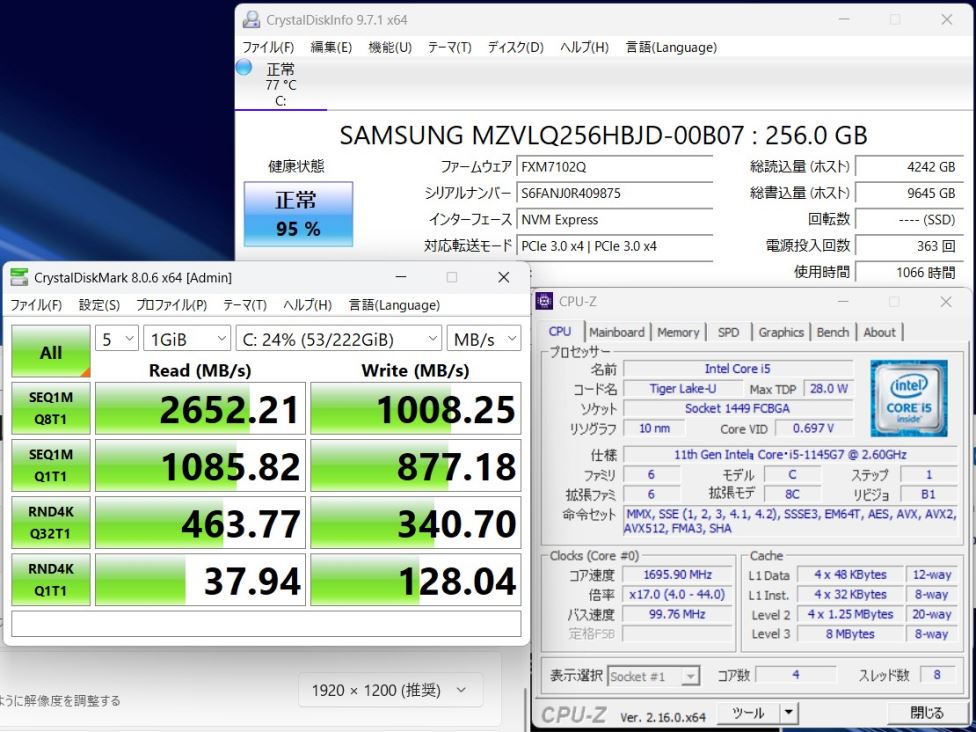 CPU:    超高速 Intel 卓越性能 第11世代Core i5-1145G7 2.6Ghz、 4コア8スレッド (ターボ・ブースト利用時の最大周波数 4.4GHz)