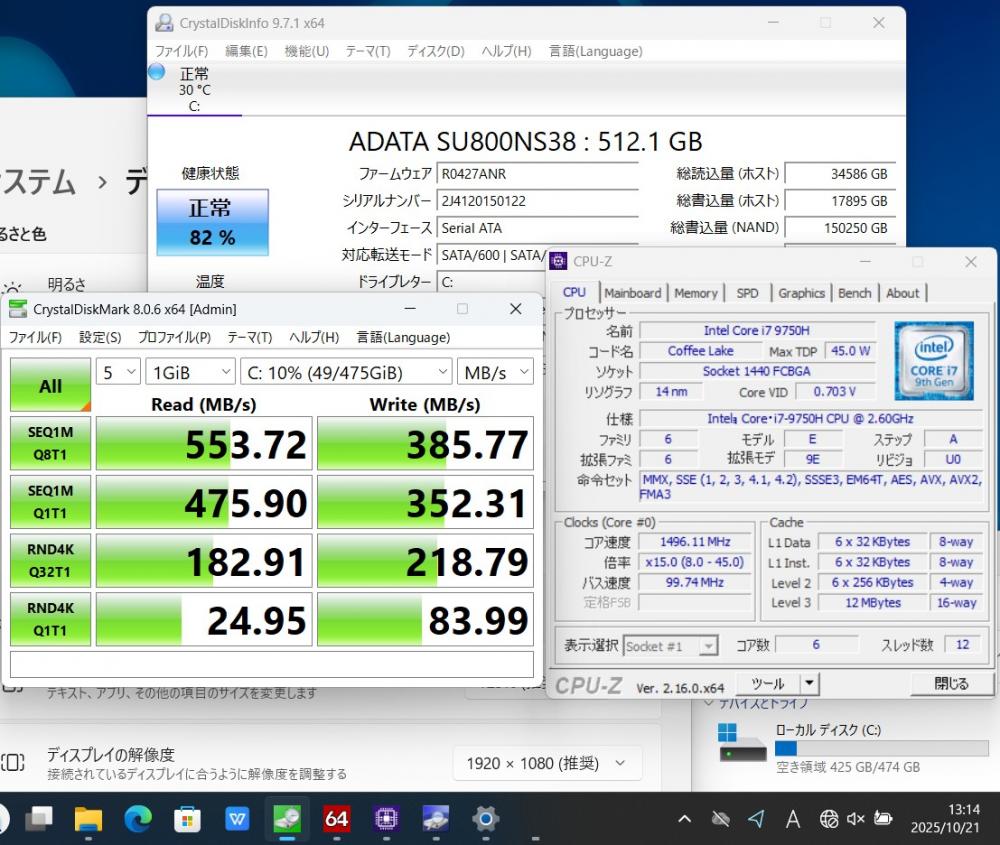 | CPU: 超高速 Intel 超高性能 第9世代Core i7-9750H 2.6Ghz、 6コア12スレッド (ターボ・ブースト利用時の最大周波数 4.5GHz) |