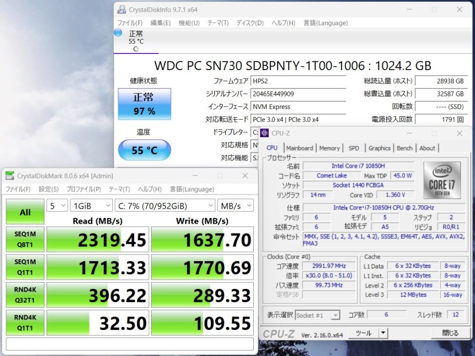 | CPU: 超高速 Intel 超高性能 第10世代Core i7-10850H 2.7Ghz、 6コア12スレッド (ターボ・ブースト利用時の最大周波数 5.1GHz) |