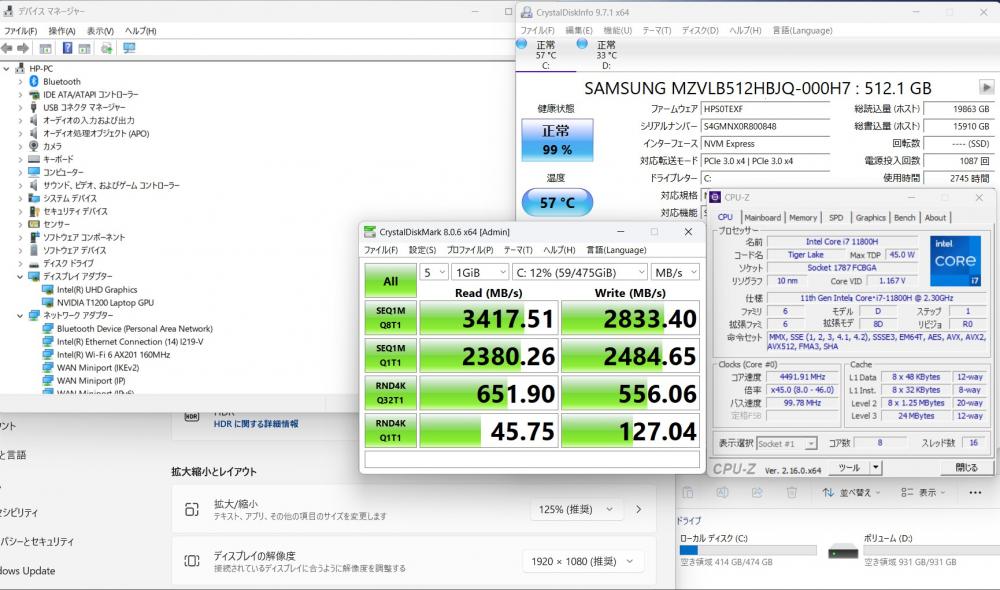 | CPU: 超高速 Intel 8コア 卓越性能 第11世代Core i7-11800H 2.3Ghz、 8コア16スレッド (ターボ・ブースト利用時の最大周波数 4.6GHz) |