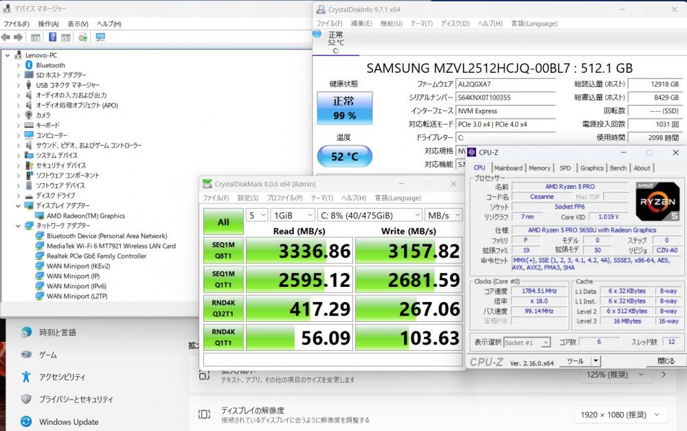 | CPU: 超高速 高性能 AMD Ryzen 5-PRO 5650U 2.3Ghz、 6コア12スレッド (ターボ・ブースト利用時の最大周波数 4.2GHz) |