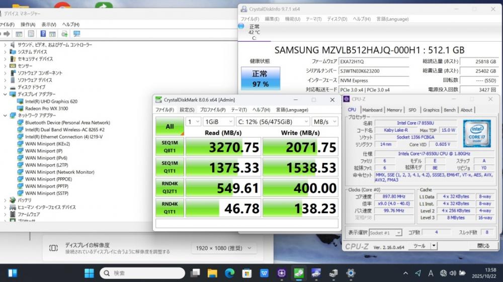 | CPU: 超高速 Intel 高性能 第8世代Core i7-8550u 1.8Ghz、 4コア8スレッド (ターボ・ブースト利用時の最大周波数 4.0GHz) |