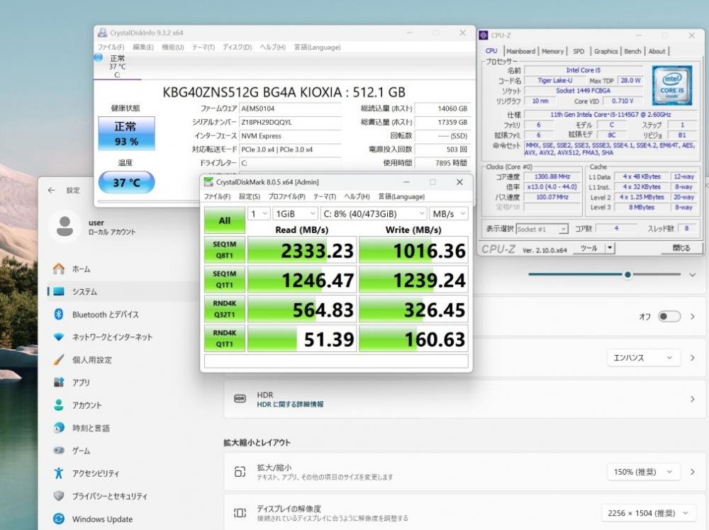 | CPU: 超高速 Intel 卓越性能 第11世代Core i5-1145g7 2.6Ghz、 4コア8スレッド (ターボ・ブースト利用時の最大周波数 4.4GHz) |