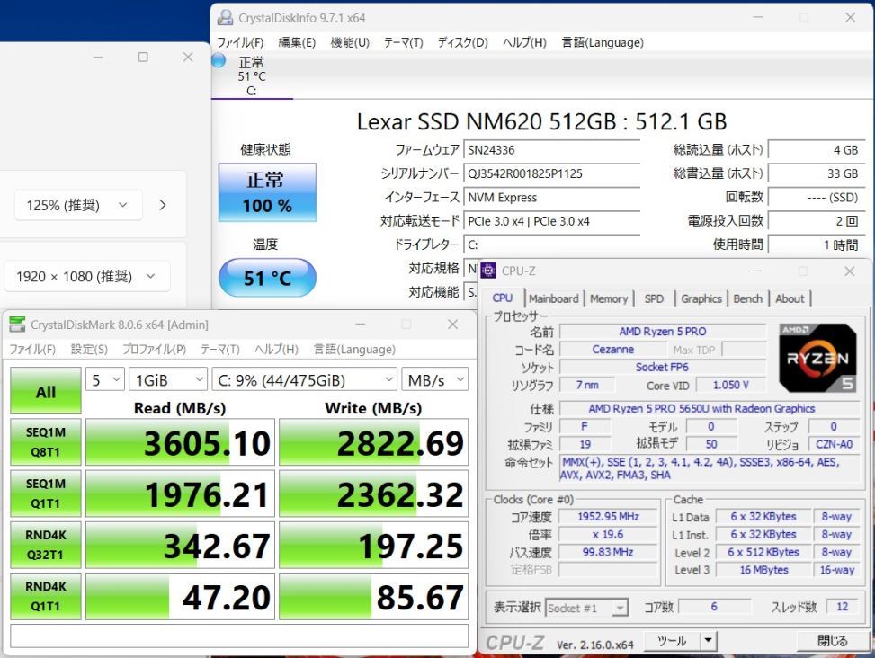 | CPU: 超高速 高性能 AMD Ryzen 5-PRO 5650U 2.3Ghz、 6コア12スレッド (ターボ・ブースト利用時の最大周波数 4.2GHz) |