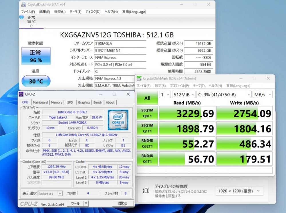 CPU:    超高速 Intel 卓越性能 第11世代Core i5-1135G7 2.4Ghz、 4コア8スレッド (ターボ・ブースト利用時の最大周波数 4.2GHz)