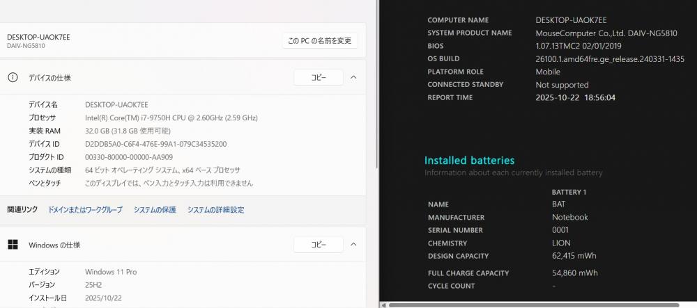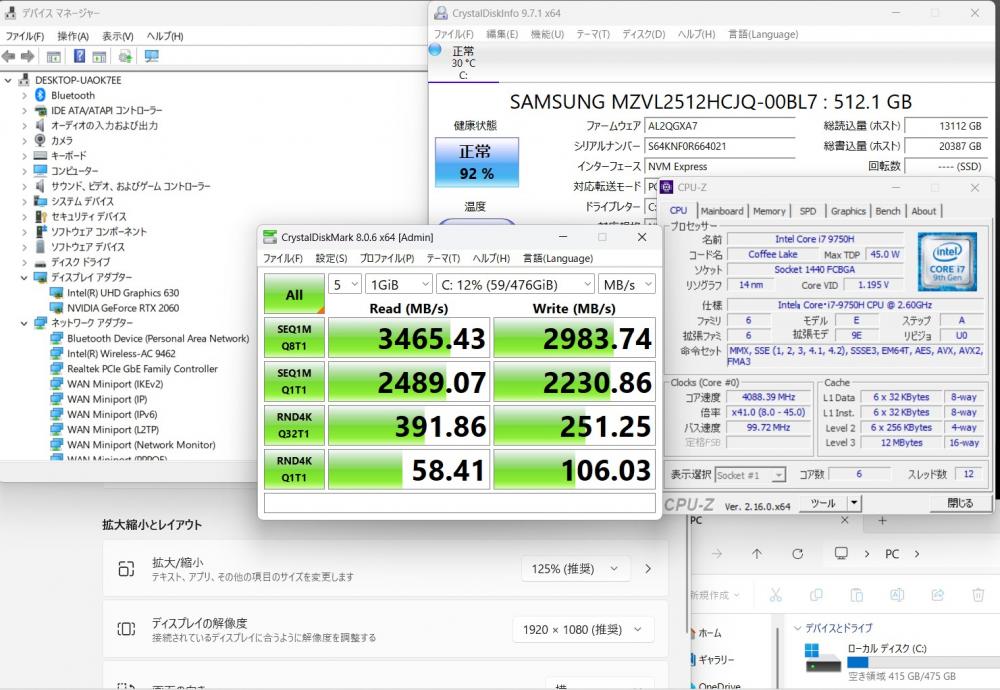 | CPU: 超高速 Intel 超高性能 第9世代Core i7-9750H 2.6Ghz、 6コア12スレッド (ターボ・ブースト利用時の最大周波数 4.5GHz) |