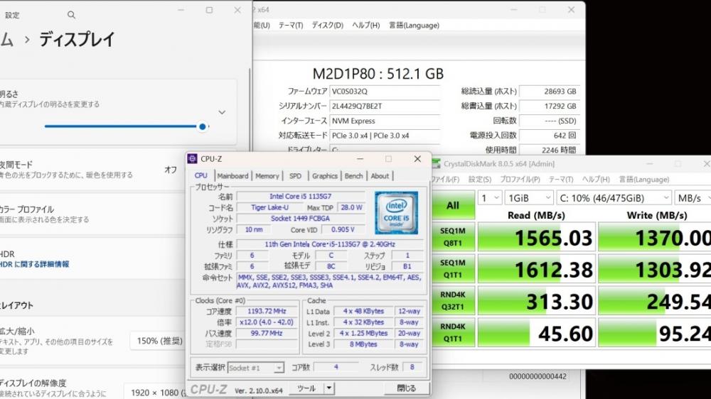 CPU:    超高速 Intel 卓越性能 第11世代Core i5-1135g7 2.4Ghz、 4コア8スレッド (ターボ・ブースト利用時の最大周波数 4.2GHz)