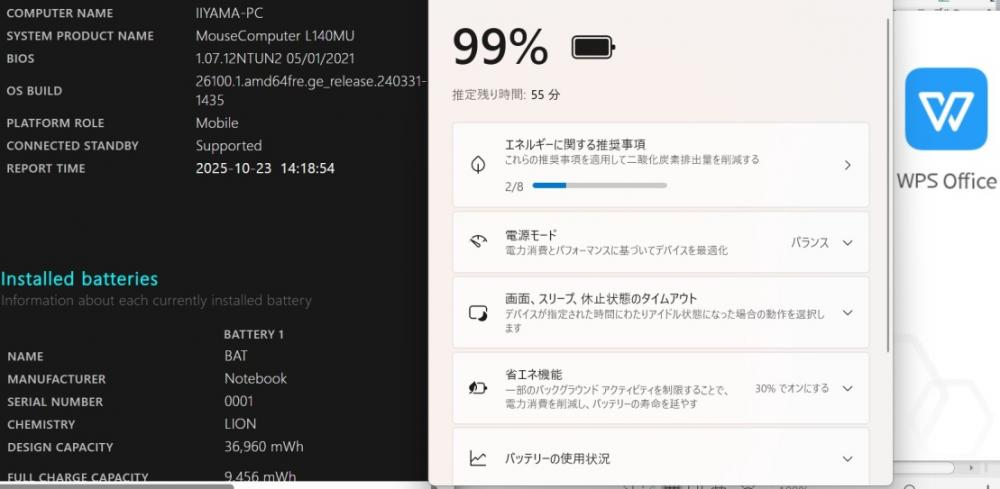バッテリー1時間位も使用可能と表示されている。 バッテリーは消耗品の為、動作補償外となります。