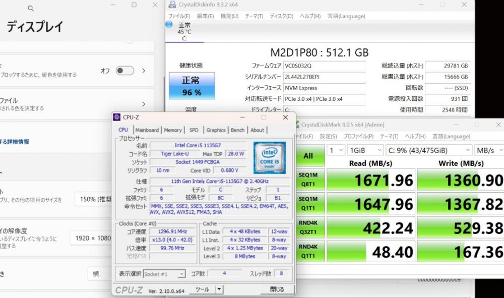 CPU:    超高速 Intel 卓越性能 第11世代Core i5-1135g7 2.4Ghz、 4コア8スレッド (ターボ・ブースト利用時の最大周波数 4.2GHz)