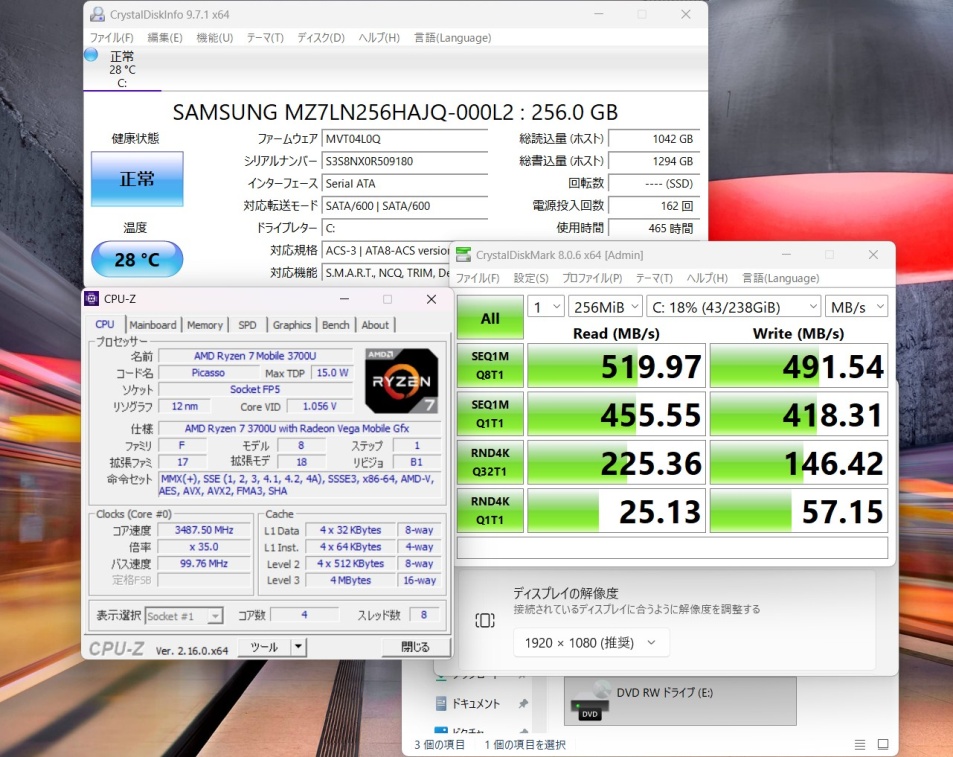 | CPU: 超高速 超高性能 AMD Ryzen 7-3700U 2.3Ghz、 4コア8スレッド (ターボ・ブースト利用時の最大周波数 4.0GHz) |