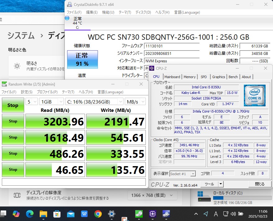 | CPU: 超高速 Intel 高性能 第8世代Core i5-8350U 1.7Ghz、 4コア8スレッド (ターボ・ブースト利用時の最大周波数 3.6GHz) |