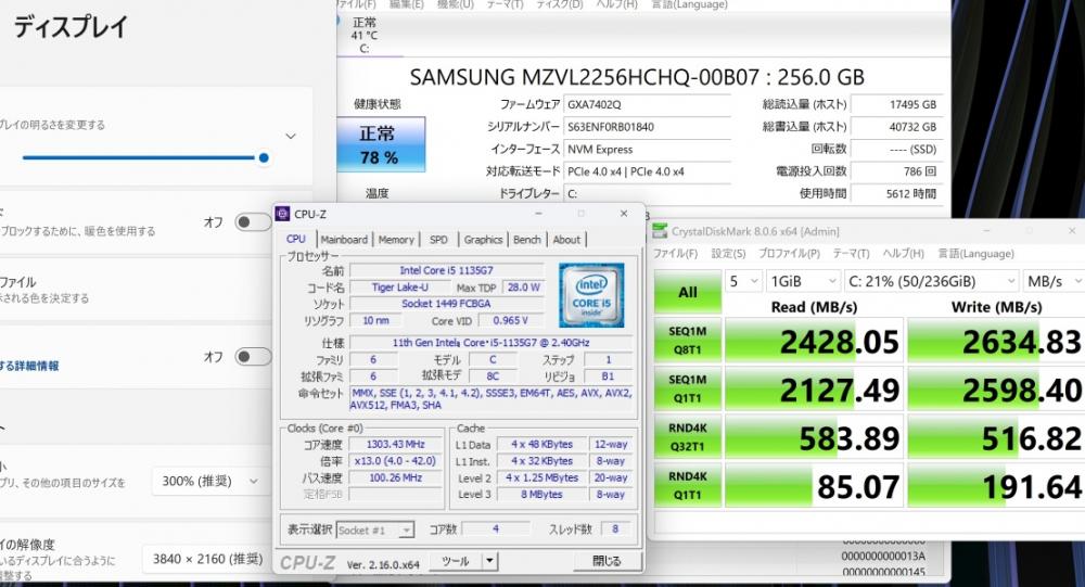 | CPU: 超高速 Intel 卓越性能 第11世代Core i5-1135g7 2.4Ghz、 4コア8スレッド (ターボ・ブースト利用時の最大周波数 4.2GHz) |