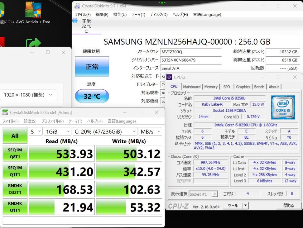 CPU:    超高速 Intel 高性能 第8世代Core i5-8250U 1.6Ghz、 4コア8スレッド (ターボ・ブースト利用時の最大周波数 3.4GHz)