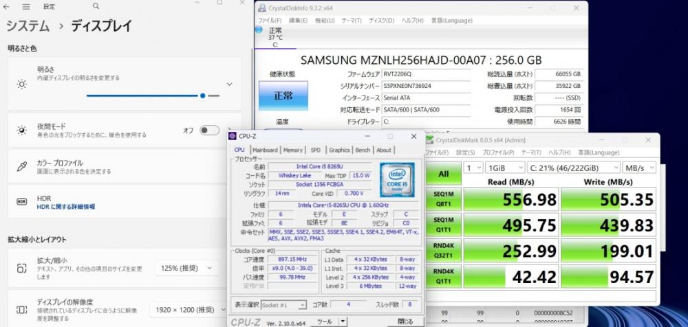 | CPU: 超高速 Intel 高性能 第8世代Core i5-8265u 1.6Ghz、 4コア8スレッド (ターボ・ブースト利用時の最大周波数 3.9GHz) |