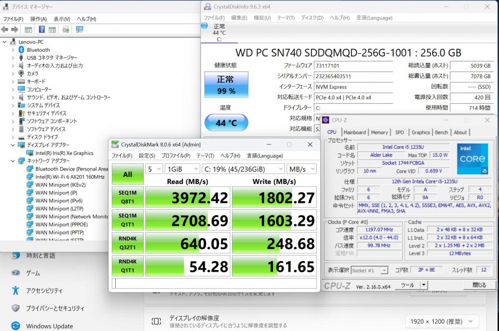 | CPU:    超高速 Intel  10コア 卓越性能 第12世代Core i5-1235U 1.3Ghz、 10コア12スレッド (ターボ・ブースト利用時の最大周波数 4.4GHz) |